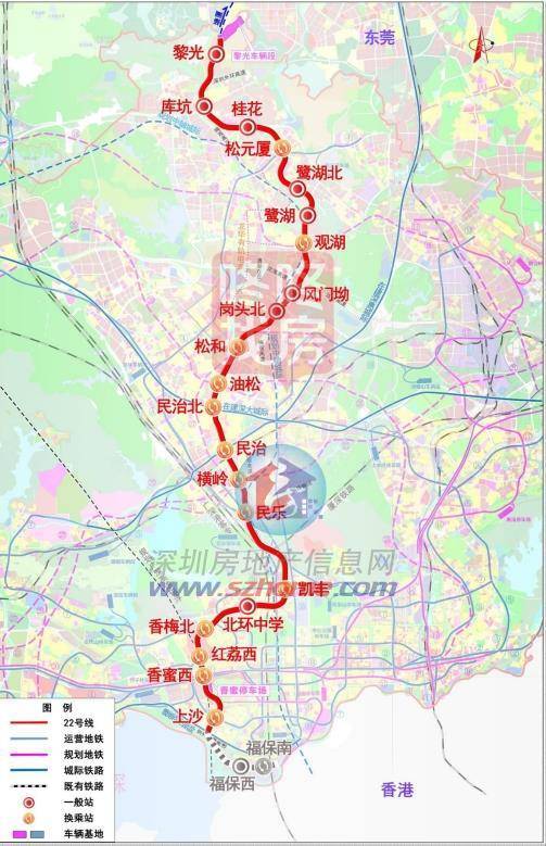 22号线承担福田中心区对龙华和东莞的辐射带动作用,缓解梅林关交通压力的功能。规划线路南起福田保税区,经香蜜湖、梅林片区转向梅林 关,沿民治大道经民治、观澜科技园、观澜中心至观澜北部黎光片区,并预留北延至 东莞的条件,线路长约36.5公里。