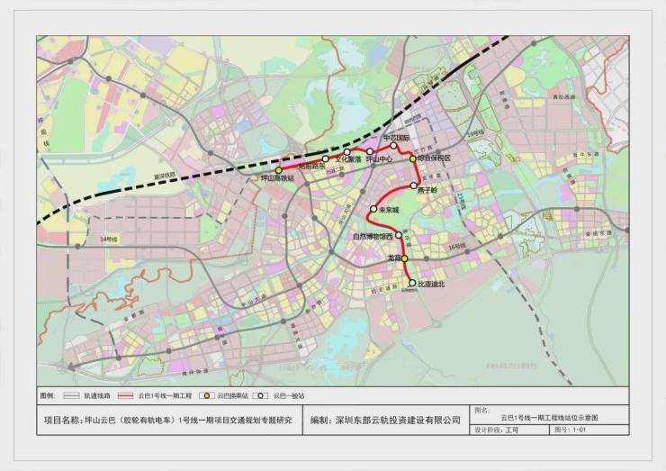 深圳坪山云巴1号线一期工程: 深圳坪山云巴1号线一期工程线路起于坪山高铁站,终于比亚迪站,全长8.506公里,采用高架敷设方式,共设11座车站,分别为坪山高铁站、站前路东站、文化聚落站、坪山中心站、中芯国际站、综合保税区站、燕子岭站、未来城站、自然博物馆西站、龙背站、比亚迪北站。