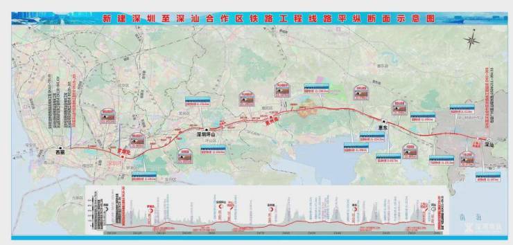 在建深圳至深汕合作区铁路工程:线路起于起自深圳枢纽西丽站,经深圳罗湖、坪山等区,惠州市至深汕合作区,引入在建广汕铁路深汕站,设计时速350公里,新建正线全长125.5公里,设6座车站。