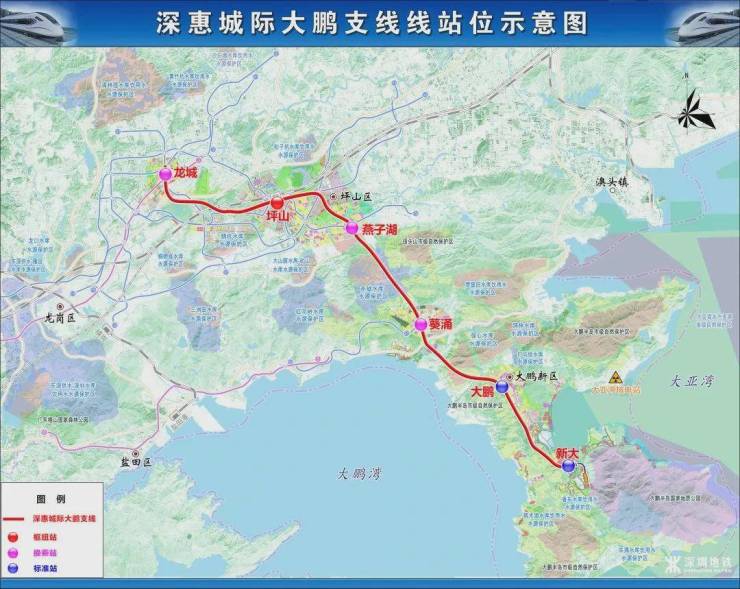深惠城际大鹏支线工程:起于龙岗区龙城站,止于大鹏新区新大站,途经龙岗区、坪山区、大鹏新区,全线地下敷设,线路全长约39.4km。
