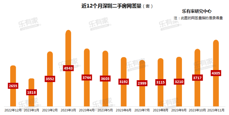 深圳市房地产中介协会数据显示:2023年11月全市二手房网签录得量为4305套,环比涨幅与10月一致,也是16%。自8月开始,深圳二手房网签量便进入了上涨区间,连续4个月上升。