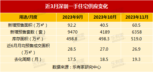 进入年底,开发商出货速度略有加快。乐有家研究中心监测显示,11月深圳新增一手住宅预售60.5万㎡,环比上涨49.7%,新增预售6358套,环比上涨51.8%。供应增加前提下,库存量再现上涨,近520万㎡,去化周期上升至19.3个月,也是近1年来的最高值。