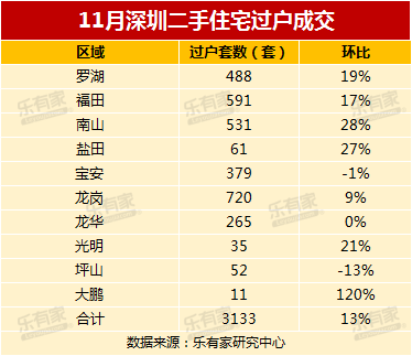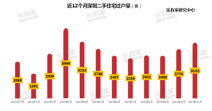 乐有家研究中心监测显示,11月深圳过户成交3133套住宅,环比上涨13%。这是今年以来深圳第三次过户量超3000套。