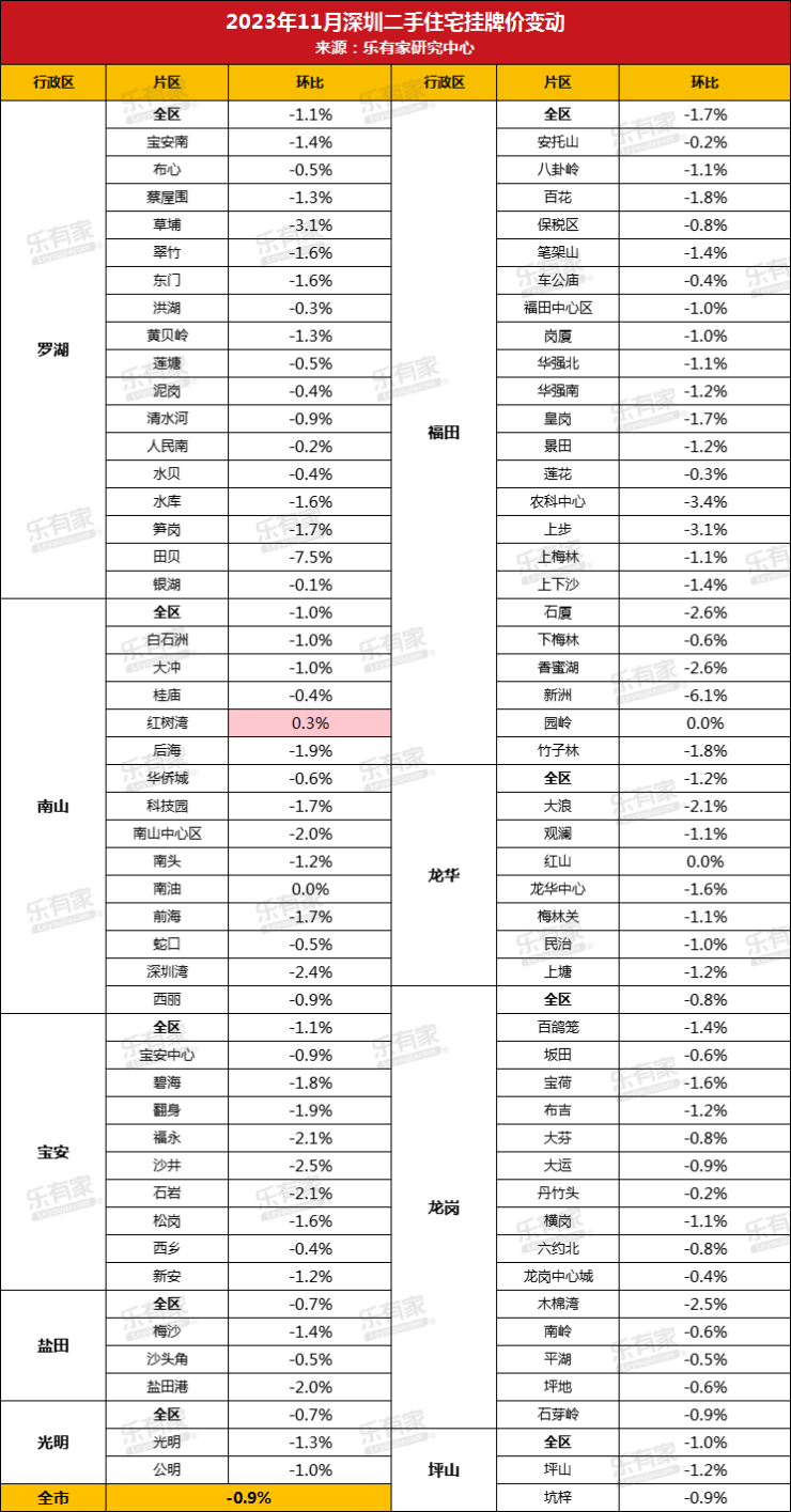 虽有新政加持市场,但深圳业主心态稳定,未现“反价”“抛售”潮。乐有家网显示,11月深圳全市挂牌价环比下跌0.9%,各片区挂牌均价仅有豪宅区域红树湾微涨0.3%,其余片区均为下跌或持平。
