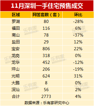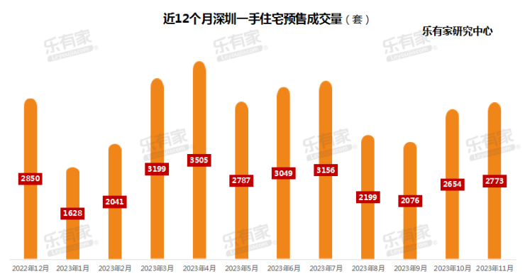 新房市场在二套房首付4成政策的助推下,成交量有所提升,维持了10月的上涨态势。预计政策效应将延续到12月。乐有家研究中心监测显示,11月深圳一手住宅预售成交2773套,环比上涨4%,连续“两连涨”。