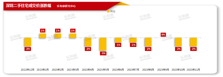 房价方面,11月深圳成交价环比跌幅维持在2%。乐有家成交数据显示,当前房源成交价近8成低于指导价,指导价已经成为绝大多数客户购房时的参考标准。