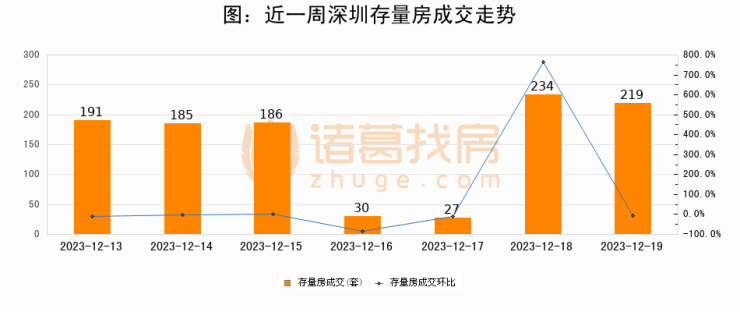 从存量房来看,2023年12月19日深圳存量房单日成交219套,比昨日减少15套,环比下降6.4%。从近一周存量房成交来看,深圳存量房日均成交套数为153套,12月19日单日成交219套,高于近一周平均水平43.1%。
