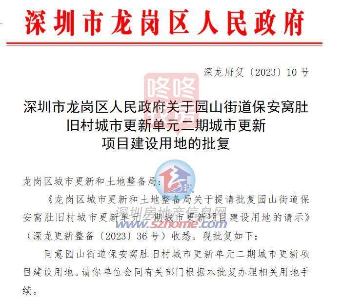 3月2日,深圳市龙岗区城市更新和土地整备局发布园山街道保安窝肚旧村城市更新单元二期城市更新项目建设用地批复的公告。