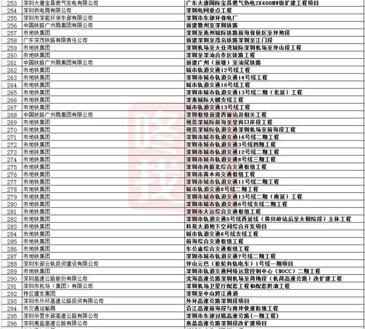 在基础设施重大项目主要涉及交通、生态领域,其中,轨道、城际铁路及重大综合交通枢纽项目中,重点推进12号线、16号线、3号线四期、16号线二期等轨道交通四期及四期调整项目,以及深汕高铁、穗莞深城际、西丽高铁站等项目。
