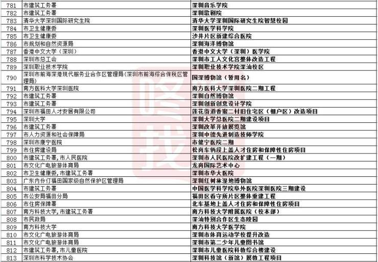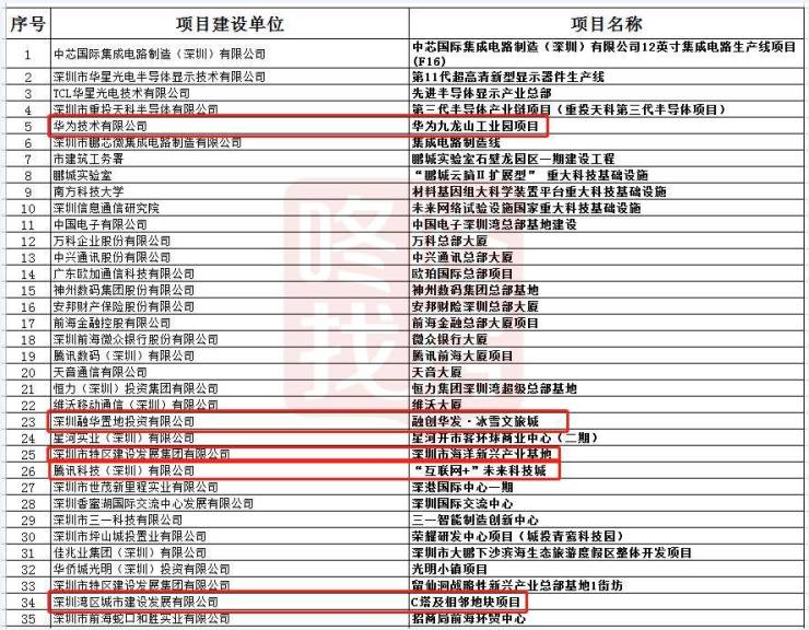 项目包括华为九龙山工业园、融创华发冰雪文旅城、深圳市海洋新兴产业基地、“互联网+”未来科技城、12号线、16号线、深汕高铁、穗莞深城际、西丽高铁站、深中通道、妈湾跨海通道、新华医院、光明高中园、坪山高中园、港中大(深圳)医学院、国深博物馆、自然博物馆等等。