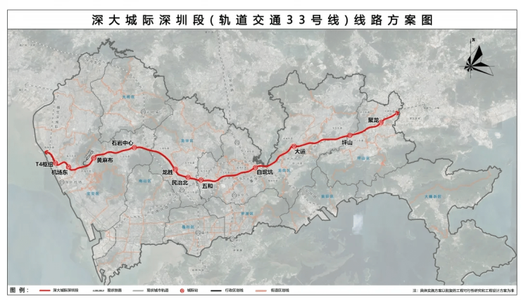 深大城际深圳段(轨道交通33号线)共设T4枢纽、机场东、黄麻布、石岩中心、龙胜、民治北、五和、白坭坑、大运、坪山、聚龙共11座车站,线路全长约69公里。目前已经开工。