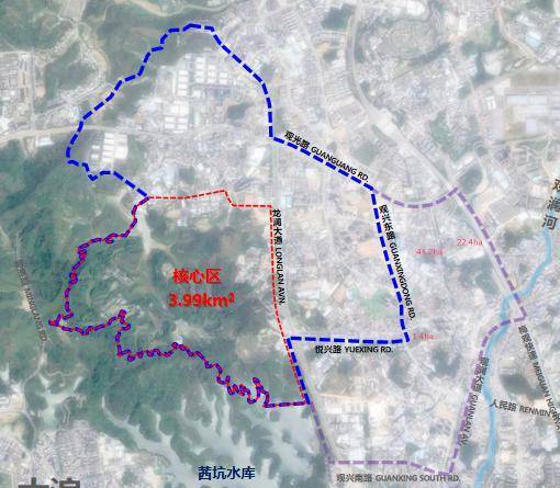 项目位于北至白花河、西临九龙山—浪荣路、南至观兴南路、东临梅观快速—观澜大道,总面积14.39平方公里,比南山高新区大;核心区规划范围西近九龙山-浪荣路,北至新丹路,东至龙澜大道,南至茜坑水库,总面积3.99平方公里。