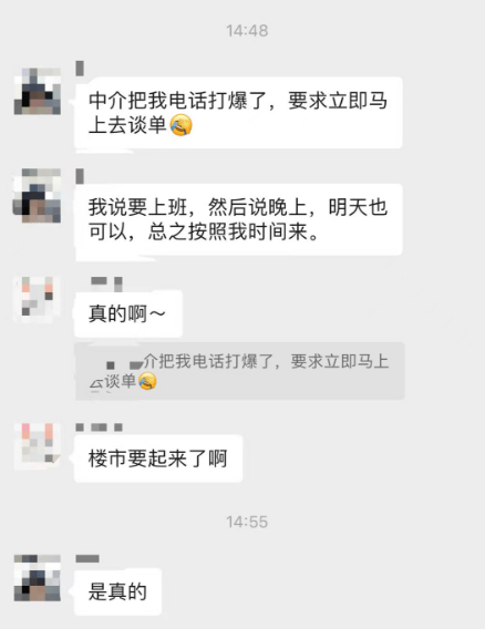 而后几天各项利好陆续出来,@L说他已经不着急了卖出了,“我昨天把价格上调了一些,还是有不少中介打电话来说有人要看房”。