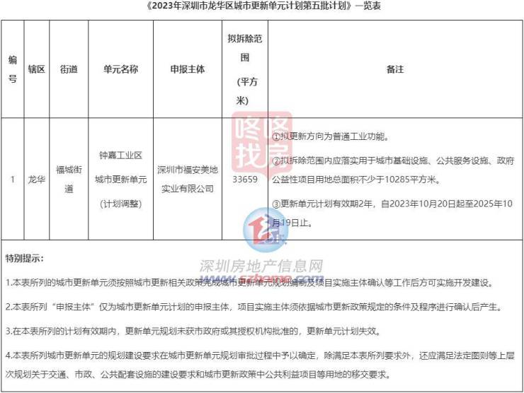 2023年深圳市龙华区城市更新单元计划第五批计划也仅有一城市更新项目,为钟嘉工业区城市更新单元(计划调整),项目位于龙华福城街道,申报主体深圳市福安美地实业有限公司。