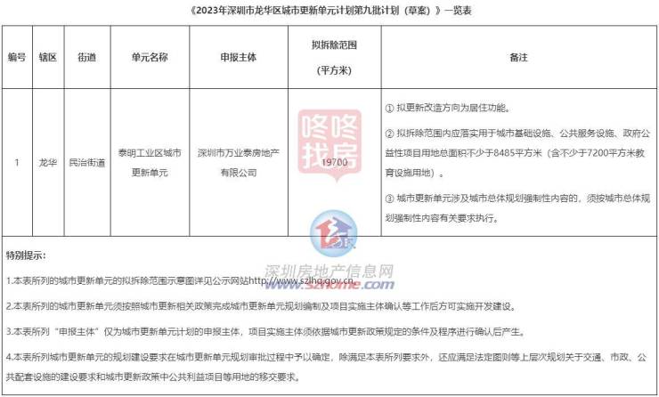 2023年深圳市龙华区城市更新单元计划第九批计划(草案)中,仅一城市更新项目,单元名称泰明工业区城市更新单元,位于龙华民治街道,申报主体深圳市万业泰房地产有限公司。