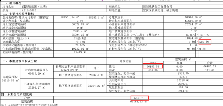 阅海境三期总建面约9.5万㎡,计容建面约7万㎡,其中住宅建面约6.6万㎡,规划总户数534户,本期停车位525个。套均建面约124㎡
