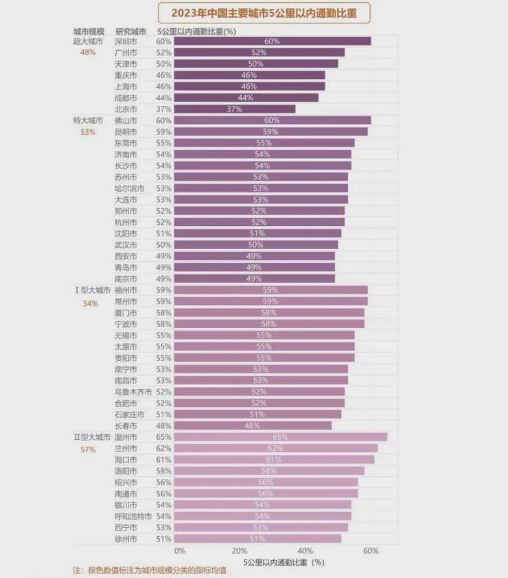 中国45个主要城市,5公里以内幸福通勤比重52%,同比提升2个百分点; 其中,超大城市48%,特大城市53%,深圳作为超大城市之一,年度增幅4-5个百分点达到60%,位居超大城市榜首。