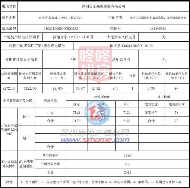 深圳市规划和自然资源局光明管理局公布东森威工业区项目《建设工程规划许可证》及总平面图。