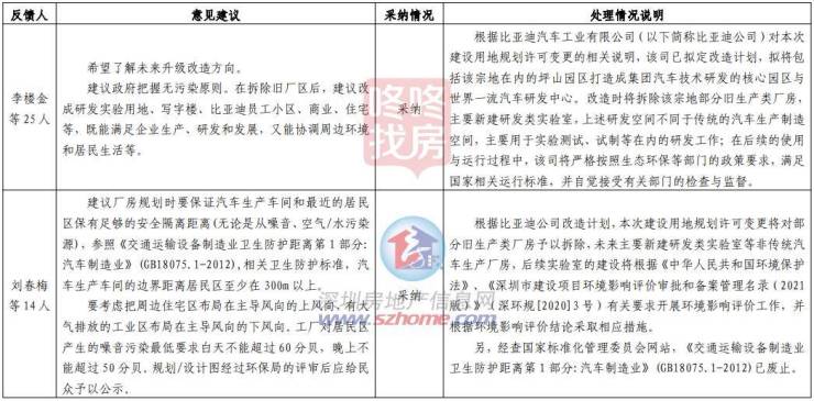 根据处理结果说明显示,根据比亚迪汽车工业有限公司(以下简称比亚迪公司)对本次建设用地规划许可变更的相关说明,该司已拟定改造计划,拟将包括该宗地在内的坪山园区打造成集团汽车技术研发的核心园区与世界一流汽车研发中心。改造时将拆除该宗地部分旧生产类厂房,主要新建研发类实验室,上述研发空间不同于传统的汽车生产制造空间,主要用于实验测试、试制等在内的研发工作。