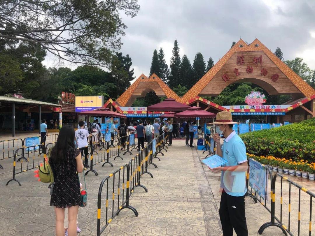 上午9点,已经有不少游客来到了深圳野生动物园,为了防止游客扎堆排队,园区提前了半小时开放。在园区门口,有工作人员负责测量游客体温,同时提醒游客出示健康码,排队间隔1.5米。
