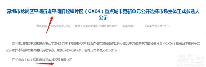 2022年6月17日通过深圳市特发华基投资有限公司对平湖街道平湖旧墟镇片区(GX04)重点城市更新单元公开选择市场参选主体进行资格审查。