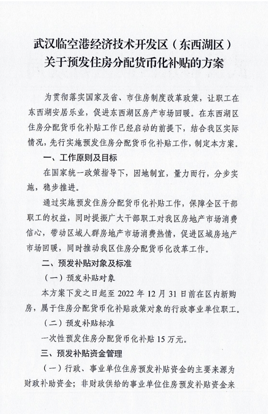 该方案显示,武汉市东西湖区属于住房分配货币化补贴政策对象的行政事业单位职工,至2022年12月31日前在区内新购房的,可获得一次性预发住房分配货币化补贴15万元。