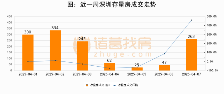 从存量房来看,2025年04月07日深圳存量房单日成交263套,比昨日增加216套,环比上涨459.6%。从近一周存量房成交来看,深圳存量房日均成交套数为182套,04月07日单日成交263套,高于近一周平均水平44.5%。