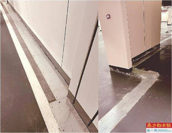 湾财社记者还发现,在一些墙边区域以及墨绿色的地坪漆上,有时会突兀地出现几块条状钢板。据张先生介绍,这些钢板下面是开发商为疏导渗水而挖的排水沟。业主指出,其中,贴近承重墙的排水沟是为了疏导墙体渗水,而远离承重墙的排水沟则是疏导地面渗水。在业主们看来,这样被钢板粉饰的排水沟既不美观,也没有从根源上解决渗水问题。