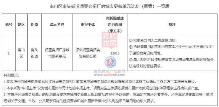 2022年5月20日,南山区城市更新和土地整备局公布了关于南山区南头街道润亚奕拓厂房城市更新单元计划(草案)。
