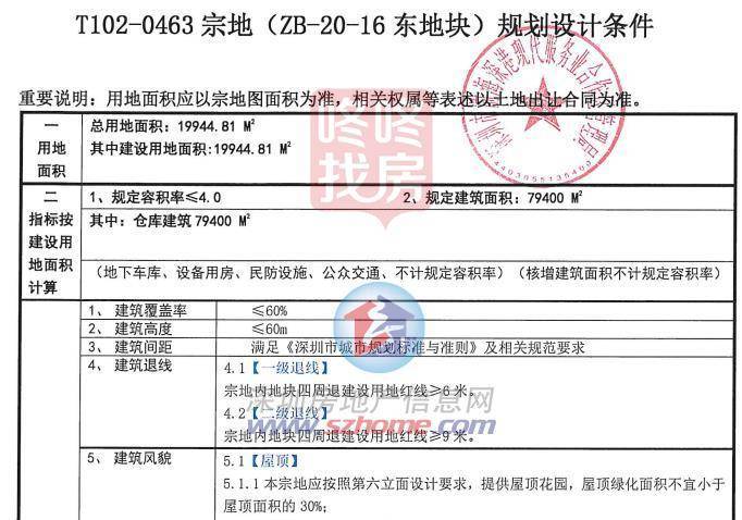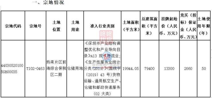 宗地号为T102-0463位于妈湾片区前海综合保税区二期,出让宗地总面积19944.05平方米,建面79400平方米(仓库建筑),地块年限为50年。