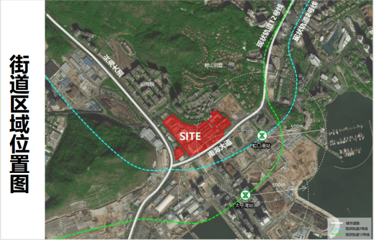 太子湾北片区城市更新单元位于招商街道兴海大道与南海大道交汇处东北侧,北侧是鲸山觐海别墅区,东侧靠育才教育集团山海学校,临近地铁2/8号线蛇口港站。