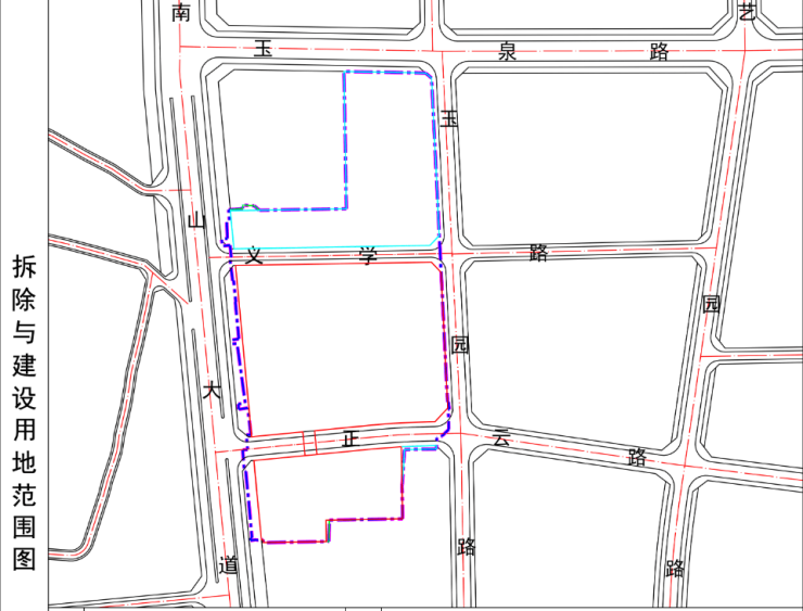 义学街城市更新单元用地面积52413.4㎡,拆除范围用地面积52413.4㎡,规划有居住、商业及教育用地。