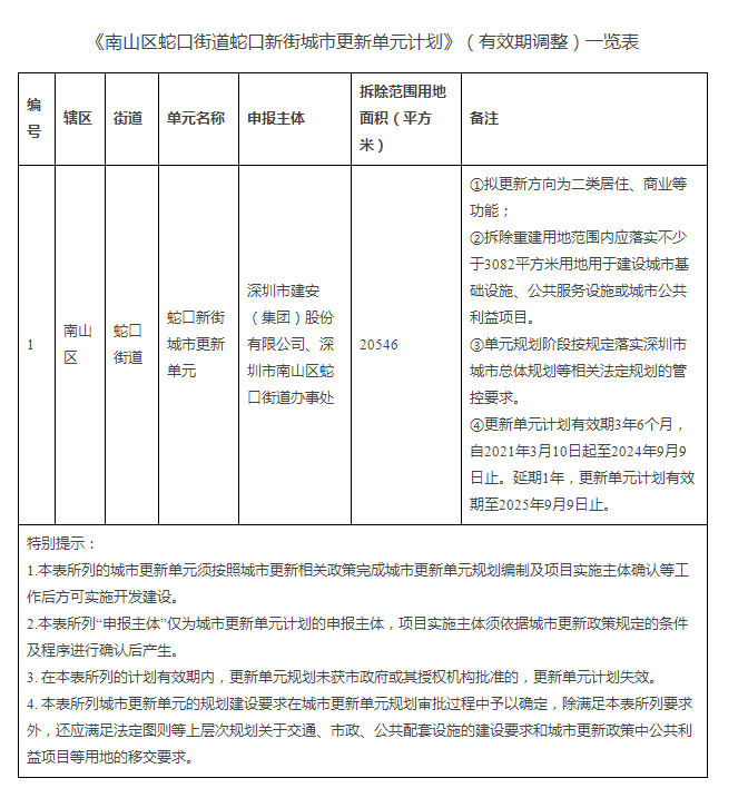 此前,南山管理局还公示了位于蛇口街道的蛇口新街城市更新单元计划有效期调整,官宣该更新单元在原计划有效期基础上延期一年,更新单元计划有效期至2025年9月9日止。