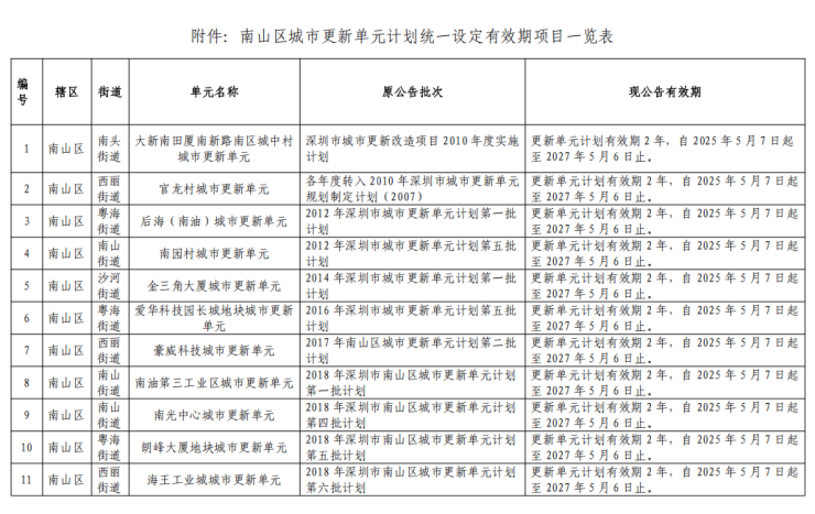 近期,南山管理局对计划已批规划未批且未明确计划有效期的城市更新单元设定有效期,集中公示了包括大新南田厦南新路南区城中村城市更新单元在内共11个项目,更新单元计划有效期 2 年,自 2025 年 5 月 7 日起 至 2027 年 5 月 6 日止。