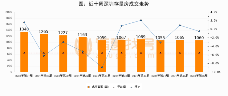 存量房方面,第36周深圳存量房成交1060套,较上周减少5套,环比下降0.5%。从近十周成交走势来看,周均成交套数为1139套,本周低于平均水平6.9%。