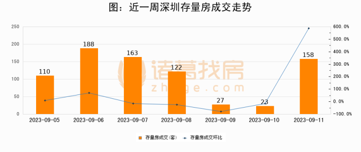 从存量房来看,2023年09月11日深圳存量房单日成交158套,比昨日增加135套,环比上涨587%。从近一周存量房成交来看,深圳存量房日均成交套数为113套,09月11日单日成交158套,高于近一周平均水平39.8%。