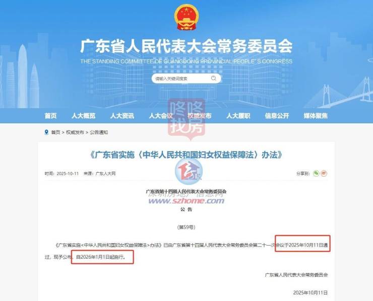 10月13日,广东省人民代表大会常务委员会发布公告称,《广东省实施〈中华人民共和国妇女权益保障法〉办法》已于近日由广东省第十四届人民代表大会常务委员会第二十一次会议通过,自2026年1月1日起施行。