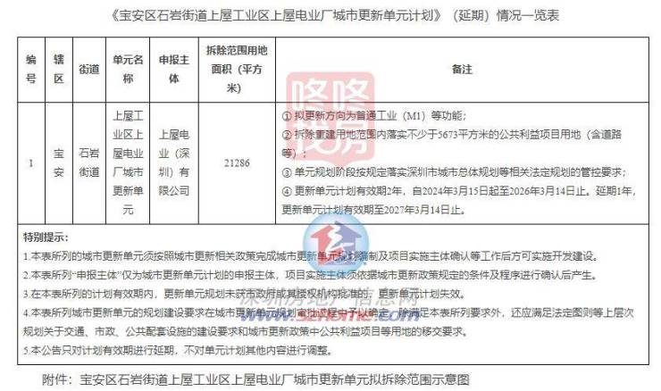近日,宝安发布了石岩街道上屋工业区上屋电业厂城市更新单元的计划延期。