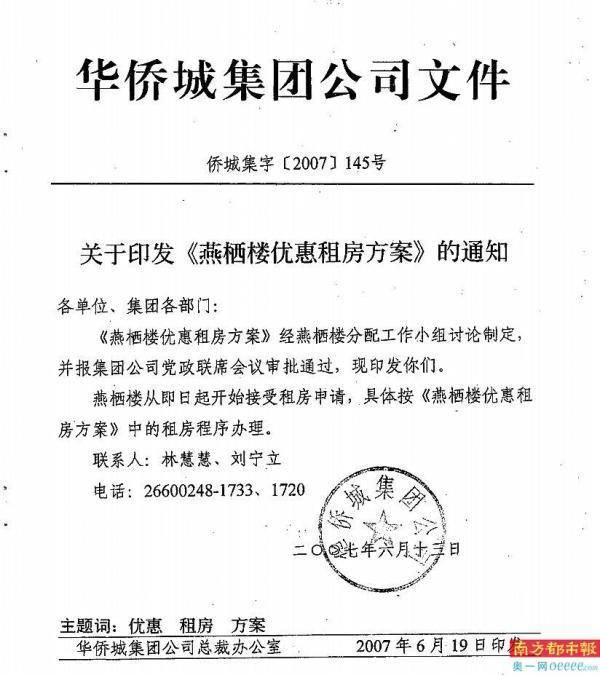 据陈凯向记者提供的资料,2007年6月,华侨城集团公司印发了《燕栖楼优惠租房方案》,其中提到燕栖楼优惠租房对象为华侨城集团在职骨干员工,只要符合相关条件,即可按照市场价房租的5折优惠租房。按照文件列出的优惠租金,租金最低的房源每月只需要2250元。