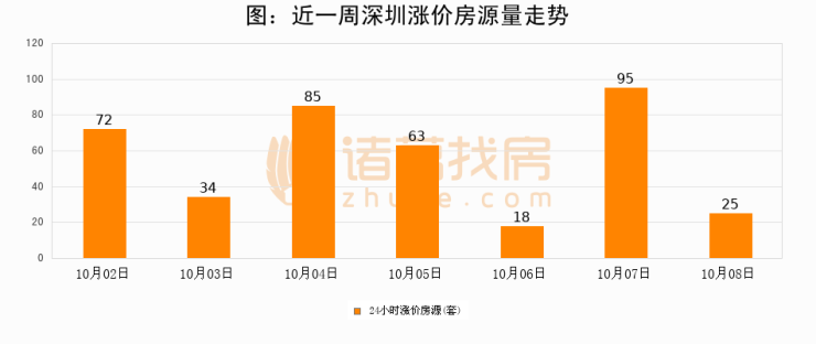 根据诸葛找房数据显示,深圳24小时涨价房源量为25套,较10月07日减少70套,环比下降73.7%。与此同时,涨价房源占比小幅回落,对于购房者来说是一个入市窗口期,购房者可抓住时机入市。