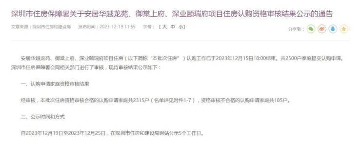 12月19日,深圳市住房保障署公示了安居华越龙苑、御棠上府、深业颐瑞府住房认购资格审核结果。