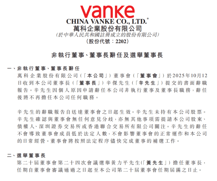 10月13日,万科发布公告,公司召开董事会会议,会议选举黄力平为公司董事长。辛杰因个人原因申请辞任公司非执行董事及董事长职务,辞任后将不再担任万科任何职务。