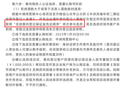 值得注意的是,根据项目方公示的销售流程,由于此次入围批次小于房源量,因此选房顺序号直接按照“冻结意向登记保证金先后顺序”,并不需要公证摇号,换句话而言,就是先到先得。
