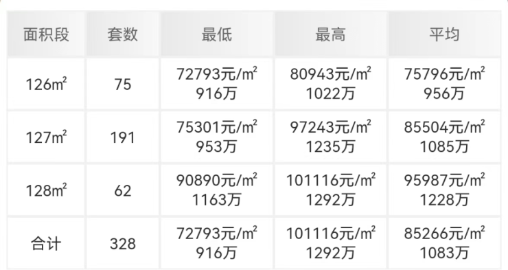 二单元户型建面约126-128㎡户型,共328套,备案单价7.2-10万/㎡,均价约8.5万/㎡,总价区间916-1292万/套。