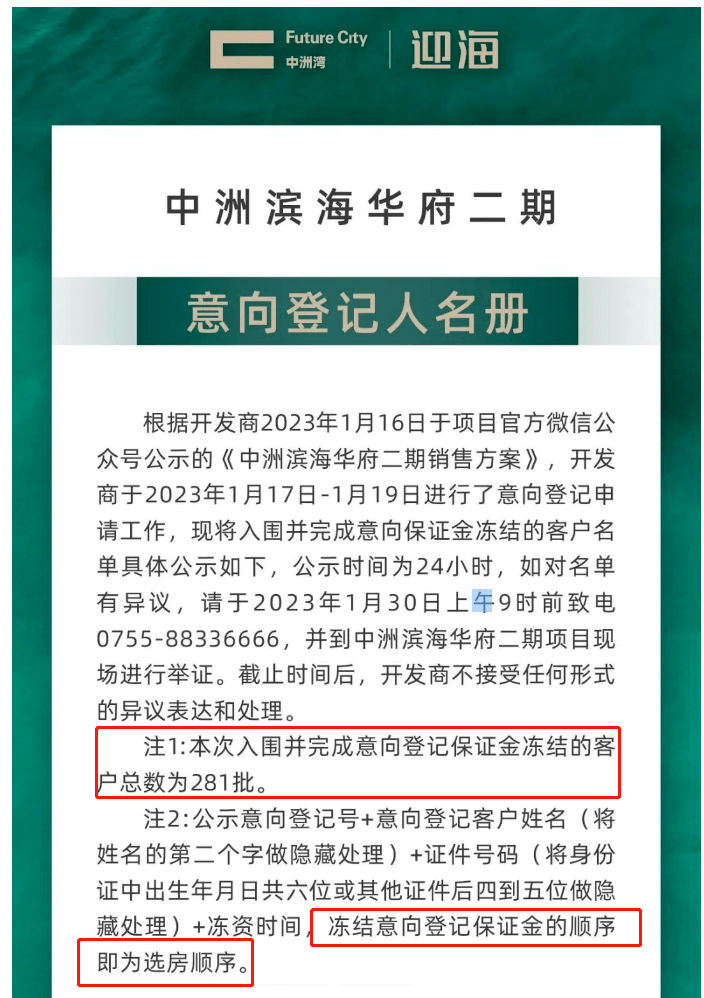 刚刚,中洲滨海华府二期公示了意向登记人名册,入围并完成意向登记保证金冻结的客户共281批,项目将于1月30日上午9:00正式选房。