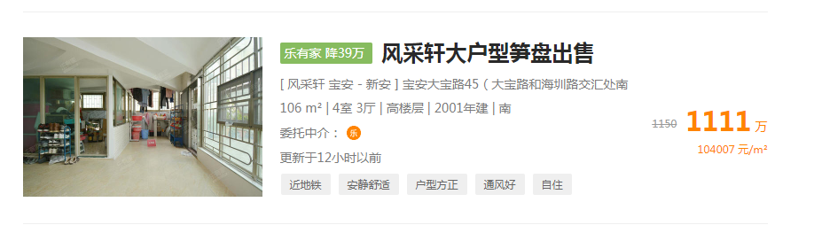 宝安区风采轩风雅轩一套房源106平方米房源,挂盘降价了39万元。