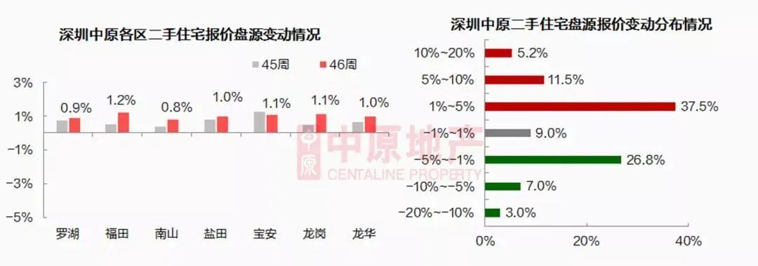 中原研究中心数据显示,业主报价上升的盘源占比为54.2%,较前一周上升4.3%。报价下跌的盘源占比为36.8%,较前一周下降1.2%。