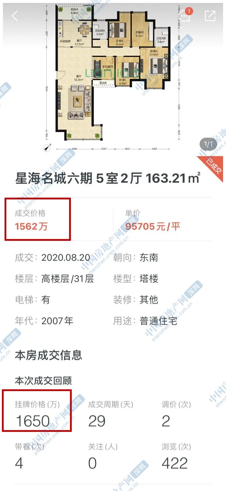 南山区星海名城六期160平米5房,挂盘价1650万元,成交价1562万元,降价88万元,降幅5%。