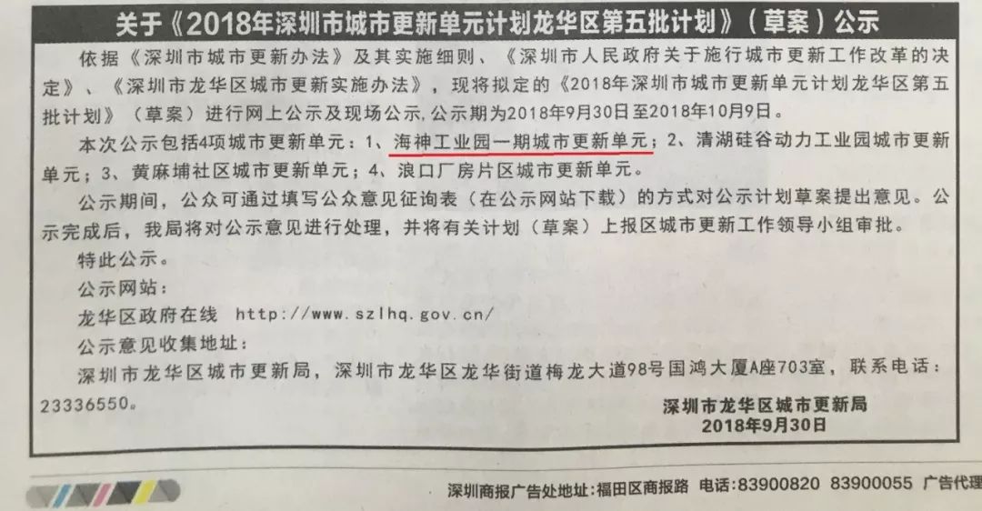 ↑↑↑2018年9月30日 星期日《深圳商报》A02版:关于《2018年深圳市城市更新单元计划龙华区第五批计划》(草案)公示