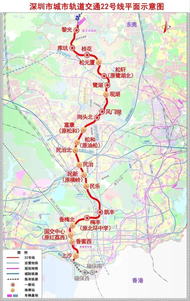 22号线一期工程起于上沙站,途经福田区、龙岗区、龙华区,终至黎光站,线路全长34.7公里。设站21座,均为地下车站。